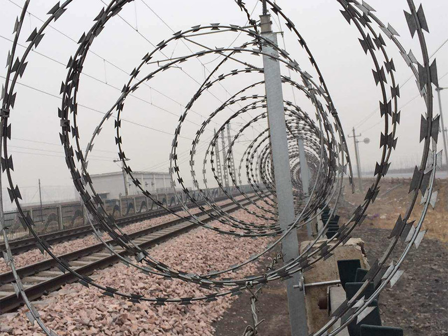 刺絲滾籠采用刀片刺繩繞圈后相臨兩圈每隔120°用刺絲連接卡固定,張開后形成蛇腹網狀,閉合后刀片刺繩圈徑為50cm,張開后每交叉圈安裝間距20cm,直徑不小于45cm。